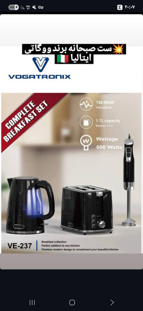 ست صبحانه وگاتی شامل کتری برقی، گوشتکوب برقی و توستر نان مدل VE237
